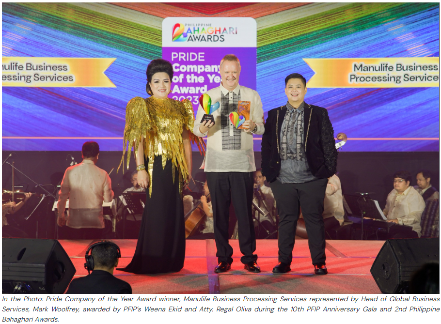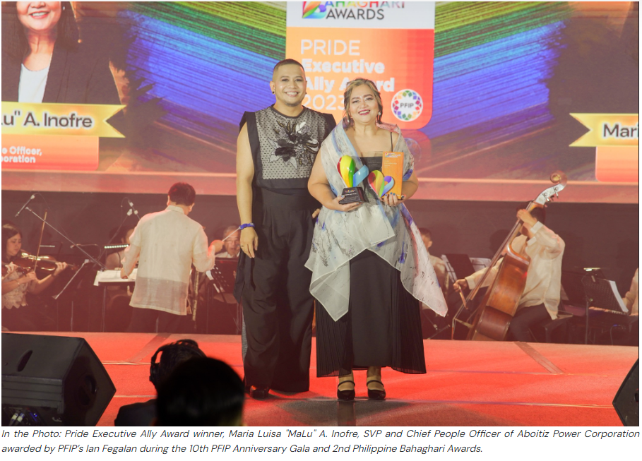 The Pride Executive Ally Award was deservingly presented to the Chief People Officer of Aboitiz Power Corporation, Maria Luisa "Malu" A. Inofre for championing LGBTQ+ inclusion through various initiatives. Also TP Pride, the LGBTQ+ network of Teleperformance, was distinguished with the Pride Network Award, celebrated for mainstreaming safety, respect, and inclusivity in the workplace. The coveted Pride Company of the Year Award was bestowed to Manulife Business Processing Services.
